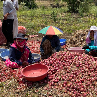 One fun detail: As we headed to the villages, we passed many fields of crops. In one field, a group of people were harvesting onions. We stopped the car, and Mathuri and I got out to go see them up close (and Mathuri wanted to buy some of their onions). We climbed down into a ditch and up again, then out to where they were working in the unbearable heat. Everyone shared some laughter (even though I needed the jokes to be translated!), and they loved that we had stopped by.