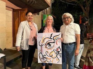 I begin this post with a quick review of the play performances in Delhi. The theatre was small and historic, and we had a decent audience for both performances, about 80 in all. Here are a few photos. *The carved Ganesh is in the hall leading into the theatre. It's like a little shrine that people touch or say a quick prayer to. * The two photos of me holding up "posters" are special: The play is actually written about the man on the right (Rajeev Prakash Khare). He and his wife (on the left) are very talented artists. He works with calligraphy and she does a variety of fine arts. Prior to each show, they demonstrated their talents, and they each gave me a poster to keep. (The woman painted an image of Ganesh; the calligraphy is from a Hindi hymn about Lord Shri Ram and Hanuman and says, "Ready to do Ram's work".)